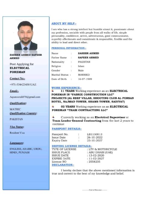 I am Zaheer Ahmed Electrical supervisor looking job I have 15 years Experience about Electrical work knowledge About LV Room MDB MCC ATS CB PANEL ets. thanks