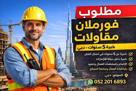 مطلوب فورمان لشركة مقاولات في دبي القصيص خبرة بالمقاولات 5 سنوات بالدولة ولدية رخصة قيادة