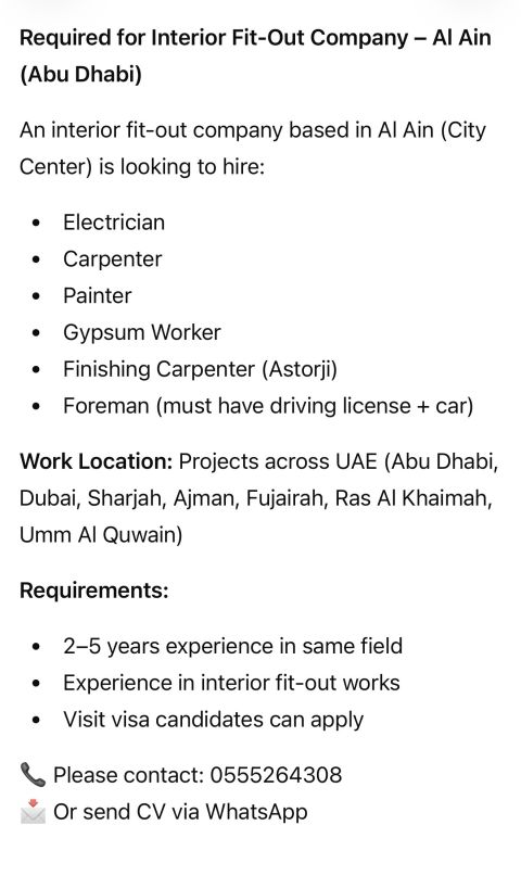 Electrician - Carpenter - Painter - Gypsum Worker - Finishing Carpenter (Astorji) Foreman (must have driving license + car) Work Location Projects across UAE (Abu Dhabi, Dubai, Sharjah, Ajman, Fujairah, Ras Al-Khaimah, Umm Al Quwain) Requirements 2 - 5 years experience in same field - Experience in interior fit - out works - visit visa candidates can apply