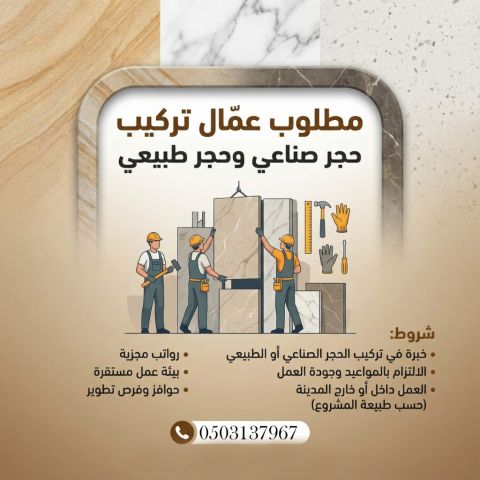 مطلوب معلمين تركيب حجر اقامات الراتب 2500 وعمال الراتب 1500 للعمل في شركة مقاولات مقرها العين الصناعية 6 التواصل للجادين فقط