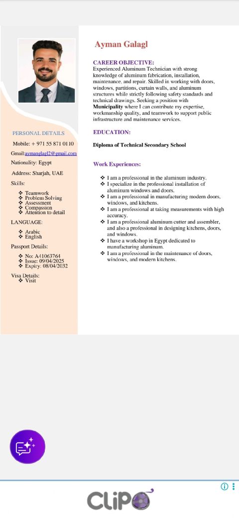 أنا صنايعي المينيوم خبرة في المجال 16 سنة من أول رفع المقاسات باحترافية الى التسليم النهائي مطابخ مودرن أبواب شبابيك كل ما يخص المجال موجود في الشارقة ومعيا زيارة شهرين فات منهم 10 أيام