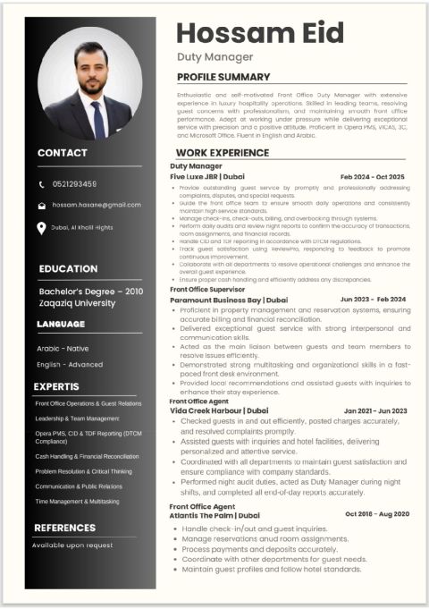 Proven leadership skills Strong problem - solving abilities Excellent communication & team management Experienced with hotel systems and operational reporting Currently inside UAE Available for immediate joining I am committed, professional, and performance - oriented, ready to add value to a reputable organization