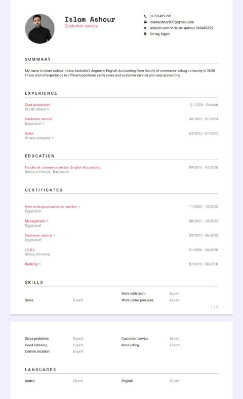 أنا عثمان محمد ابحث عن عمل، عملت كموظف استقبال في شركات كبيرة وأعرف جيدا التعامل مع الحاسب الآلي وكيفية استخدام جميع التطبيقات المتعلقة بالحاسب الآلي وأيضا ضبط وحجز المواعيد للمقابلات للشركة والرد على الاتصالات، أتحدث العربية والانجليزية بطلاقة لدي خبرة كافية في هذا المجال لمدة لا تقل عن ثلاث سنوات، وعملت أيضا في مجال العقارات ولدي خبرة عنها، أرغب في العمل في بيئة عمل تطور من الذات وكسب خبرات