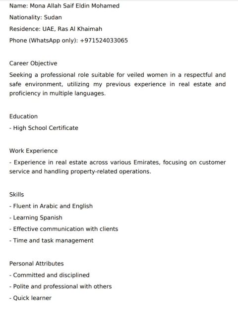 فتاة سودانيه بشهادة ثانوي خريجه حديثة ابحث عن عمل يوفر اقامات ويستقبل المنقبات أتحدث العربية والانجليزية وأتعلم الإسبانية خبر في التسويق والعقارات وخدمة العملاء ومراكز الاتصال