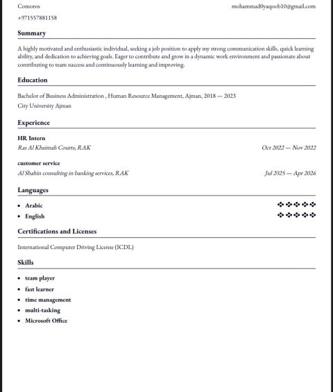 خريج بكالوريوس ادارة الأعمال في الموارد البشرية، من ضمن خبراتي متدرب موارد بشرية في دائرة المحاكم وموظف خدمة عملاء في شركة خاصة، أجيد اللغة العربية والانجليزية وامتلك شهادة في الحاسب الآلي ICDL وخبرة في ادخال البيانات، جاهز للتوظيف فوري