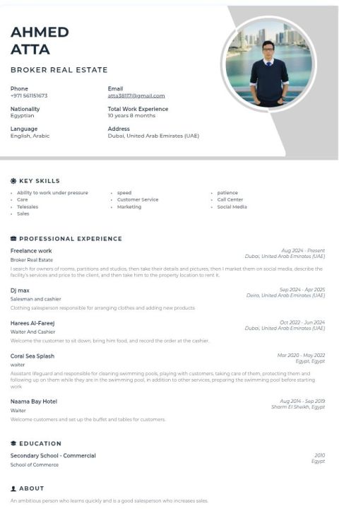 أحمد، مقيم في العين بحاجة "ماسة" الى عمل، مكتبي أو اداري أو اشراف كمساعد مكتب أو تنفيذي أو منسق اداري أو مساعد شخصي أو خدمة عملاء، خبرة داخل وخارج الدولة أكثر من 10 سنوات في مجالات خدمة العملاء وإدارة وتنسيق فرق العمل والحسابات والاشراف وتنسيق العمليات والمواعيد وتسجيل الحركات اليومية والمالية وخبرات أخرى، سريع التعلم وحسن التعامل مع الاستفسارات وحل مشاكل العملاء، وأتحدث الانجليزية، ولدي رخصة قيادة