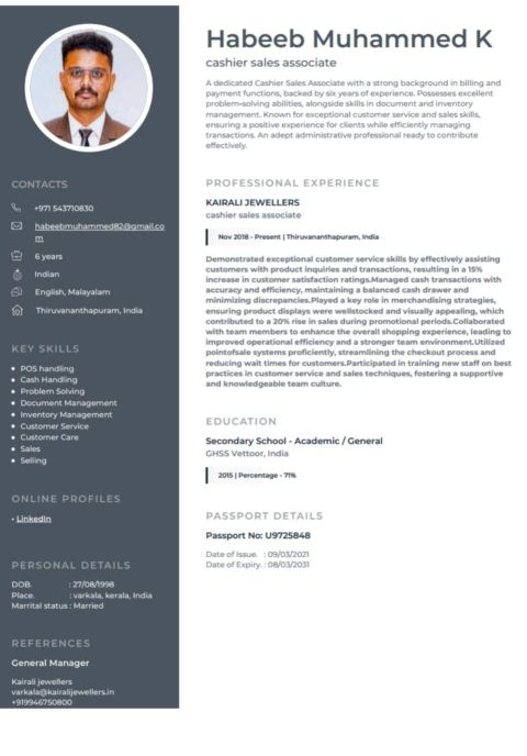 I am looking for a job in UAE, I have experience in cashier, customer service, sales, and also I have experience in ms excel, word etc. I can do jobs like cashier sales, customer service, store keeper, data entry, office assistant roles, please consider my profile if you are looking for a candidate for above mentioned roles