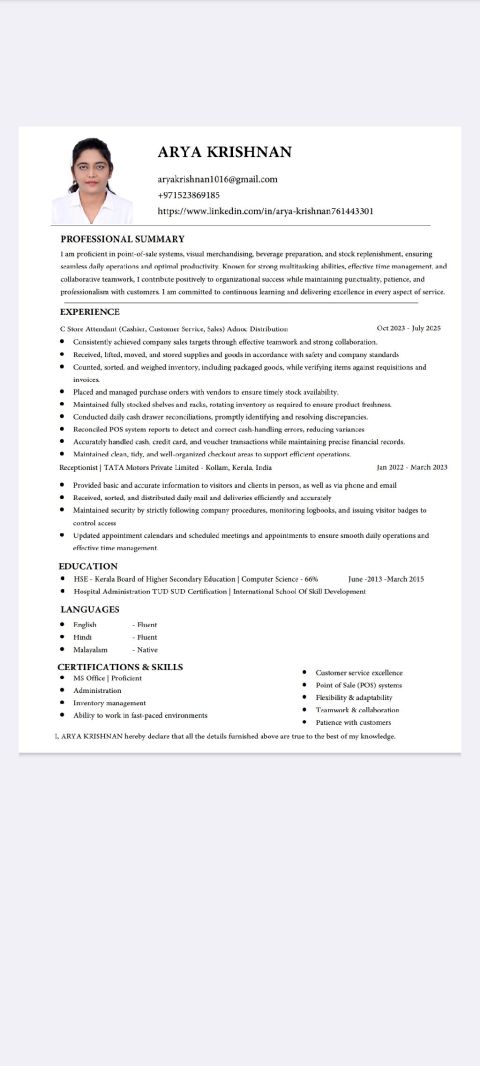 I am Arya Krishnan. Seeking new opportunities in Cashier, Customer Service, Sales and Reception. I have 2 year experience of working in Retail Department (ADNOC Distribution) as Cashier, Customer Service and Sales. Sedking new job role in Dubai Emirates. I am efficient in handling POS, Inventory Management, Cross Selling & UpSelling products, Handling Customer Complaints, Ordering & Receiving items