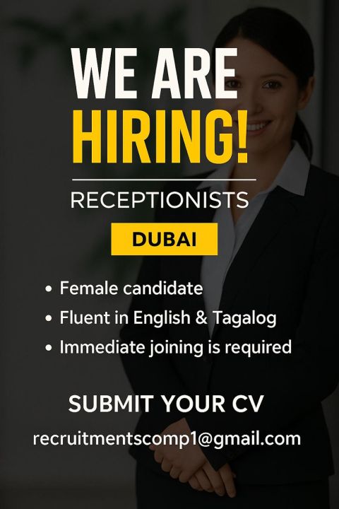 We are directly hiring Customer Service & Receptionist for our Medical Center at Burjuman, Dubai. Candidate must have minimum one year work experience in UAE. Salary AED3000 - AED4000 including free visa, accommodation & other benefits as per UAE law. Any nationality can apply only if you're inside UAE. To Apply, Submit your CV to mention