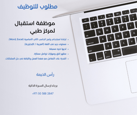 ن A medical center in Ras Al-Khaimah is looking to hire a Receptionist with experience in reception and marketing. Requirements Previous experience working in a medical center. Experience in marketing and customer service. Preferably residing in Ras Al-Khaimah. Excellent communication and interpersonal skills. Ability to manage appointments and deal with patients professionally. Interested candidates