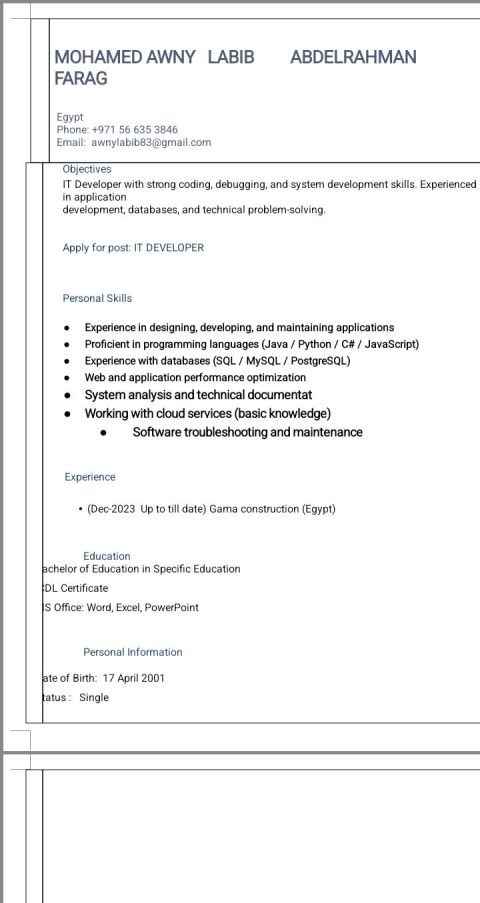 الاسم المصطفى الطيب اسماعيل سوداني الجنسية خريج علوم حاسوب جامعة السودان للعلوم والتكنولوجيا العمر 29 الوظيفة مدخل بيانات ممتاز السكن أبوظبي بالقرب من الكورنيش