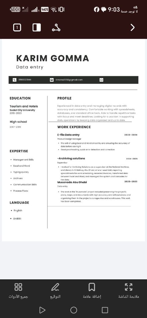 أنا محمد شاب مصري 22 سنة ابحث عن عمل لدي خبرة في برامج الأوفيس (excel, word) ودفتر الحسابات وبرنامج العين سوفت كنت اعمل داتا انتري أو متابع أو محاسب في شركات توصيل ولدي خبرة في الكمبيوتر للتواصل على الرقم