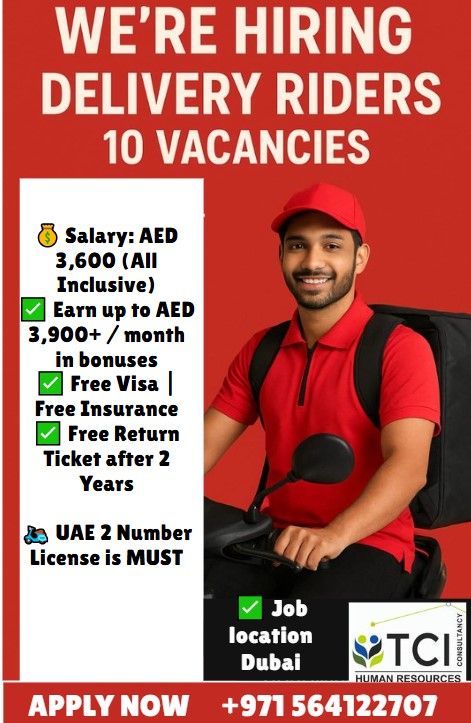 WE’ RE HIRING - Delivery RIDERS Minimum Take - Home Salary AED3600 + bonuses Daily Bonus (11 - 15 orders/ day) AED20 per order after the 10th order Earn up to AED2600 per month in bonuses Daily Super Bonus (16 + orders/ day) AED25 per order after the 15th order Earn AED3900 + per month in bonuses Benefits Free insurance Free employment visa Free return air ticket after completing 2 Years Deira