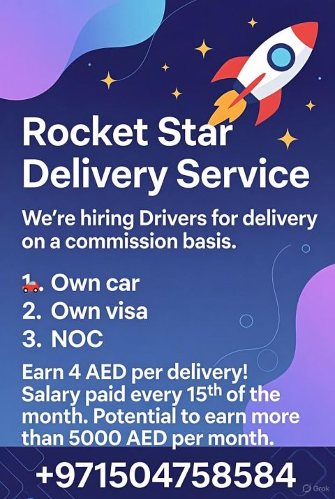 Sharjah - Warehouse location - Shajrah Industrial Area 7. Join Rocket Star Delivery Service We're hiring Drivers for delivery on a commission basis Earn AED4 per delivery Salary paid every 15th of the month. Potential to earn more than AED5000 per month Requirements 1. Own car 2. Own visa 3. NOC. Contact us now and grab the opportunity