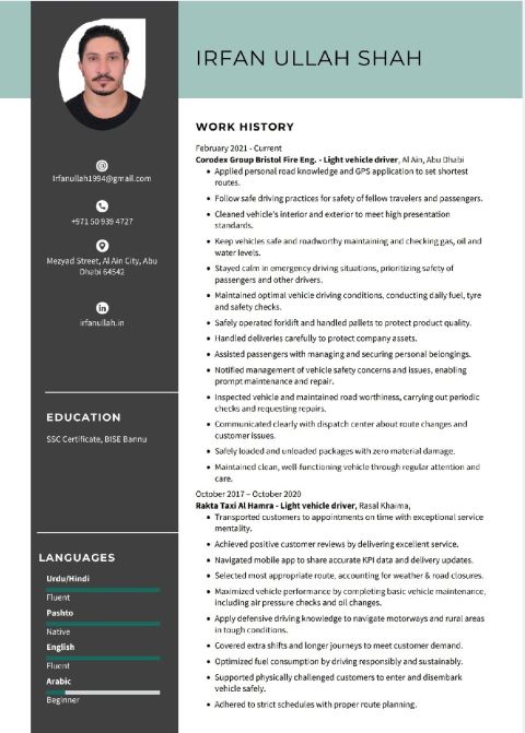 Looking for driving job 8 years experience speak English Arabic Urdu professional driver, age 27 nationality Pak, hubby gym trainer