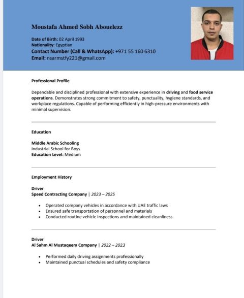 أنا شاب مغربي 33 سنة أتحدث العربية والانجليزية لدي شهادة سياقة أوتوماتيك ابحث عن عمل سائق ليس لدي خبرة جيدة في السياقة داخل الامارات حصلت على الرخصة مند ستة أشهر لدي خبرة في المطاعم أنا عملي الأصلي طباخ نظرا للظروف الحالية التي تمر بها المنطقة عكوما ابحث عن عمل في مجال السياقة لدي اقامة سارية ورخصة سارية