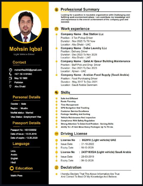 اسمي محسن اقبال، وأنا مهتم بالعمل كسائق سيارة خفيفة، حتى حمولة 3 أطنان أو شاحنة صغيرة
