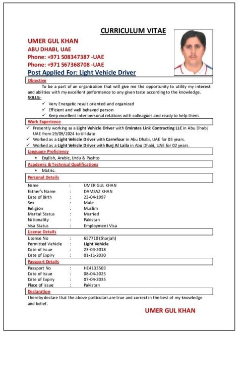 My name is umer Gul Khan I am from Pakistan and I have light vehicle license 7 year old before I work in Carrefour 3 years