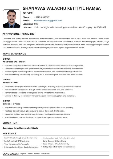 My name is shanavas, I am from India, Kerala, I have a driver's license in the Emirates, Bahrain and Kuwait. Expected salary AED2500 with food and accommodation