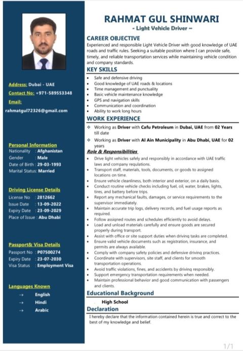 My name is sunaid khan I am 26 years old looking for light vehicle driver job my UAE driving experience 3 years I know all location UAE