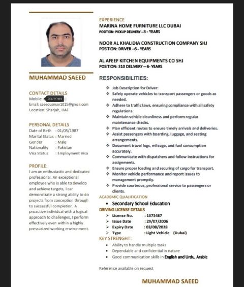 I am mukthar nasir Reliable and responsible driver with valid UAE driving license and own vehicle, seeking a full time or part time driving or delivery position. Familiar with UAE roads and committed to safe, timely, and professional service