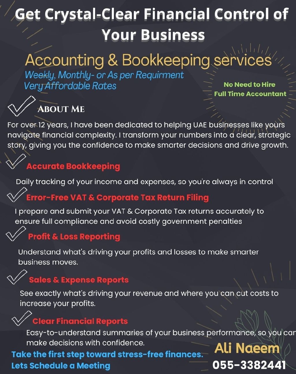 Stop Accounting Stress Your business deserves expert finance management without a full time cost. With 12 years of flawless UAE experience, I ensure your accounts are accurate and compliant. I provide top - tier, part time accounting services Bookkeeping Keeping the record of each transaction. VAT & Corporate Tax Prepare & Filing monthly Reports ( P L Cash Flow)