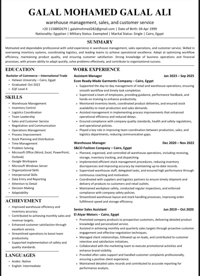 جلال محمد 26 سنة متواجد داخل الدولة تأشيرة سياحة وفاضل فيها 10 أيام اشتغلت محاسب وأمين مخازن 3 سنوات بشركة أس اند كو الصينيه وعملت سابقا سيلز في معرض الا طيار موتورز ومسؤول عن الكار كار وعملت سابقا سيلز في براند ikon وتم ترقيتي الى مدير الفرع ويوجد خبرة في مجالات المطاعم والكاشير