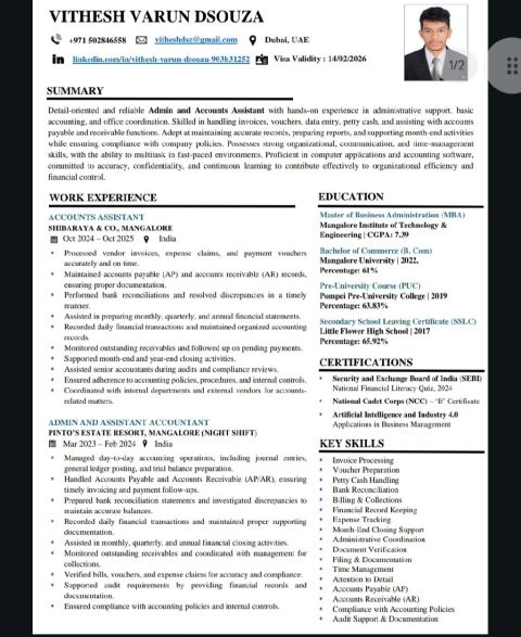 Accountant and Audit Assistant with 3.5 years of experience across all major financial areas, including Accounts Payable, Accounts Receivable, general ledger, financial reporting, audits, taxation support, reconciliations, and compliance. Detail - oriented with strong analytical skills and a proven ability to ensure accuracy, controls, and timely financial processes