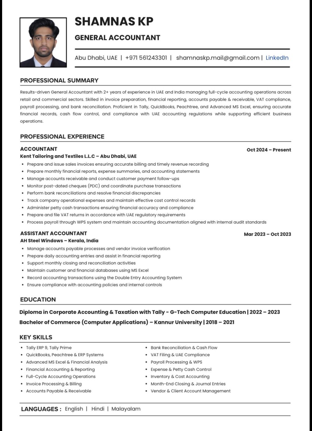 A motivated and detail - oriented Accountant with 2 years of professional experience is seeking a suitable opportunity to contribute to a dynamic organization