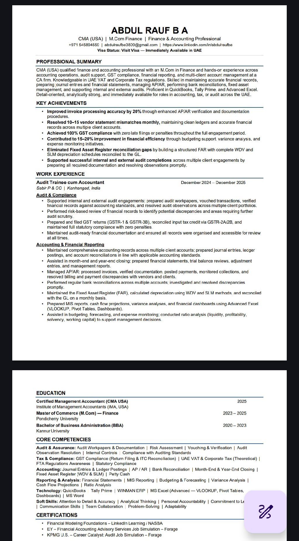 متخصص في المحاسبة والمالية حاصل على شهادة CMA (أمريكية) وماجستير في المالية متاح فورا في الامارات بتأشيرة زيارة. لدي خبرة في الذمم المدينة والدائنة، المطابقات البنكية، التقارير المالية، ضريبة القيمة المضافة، الميزانيات، ودعم التدقيق. أجيد برامج Tally وQuickbooks وExcel. ابحث عن وظيفة محاسب / محلل مالي / مدقق في أي مكان في الامارات