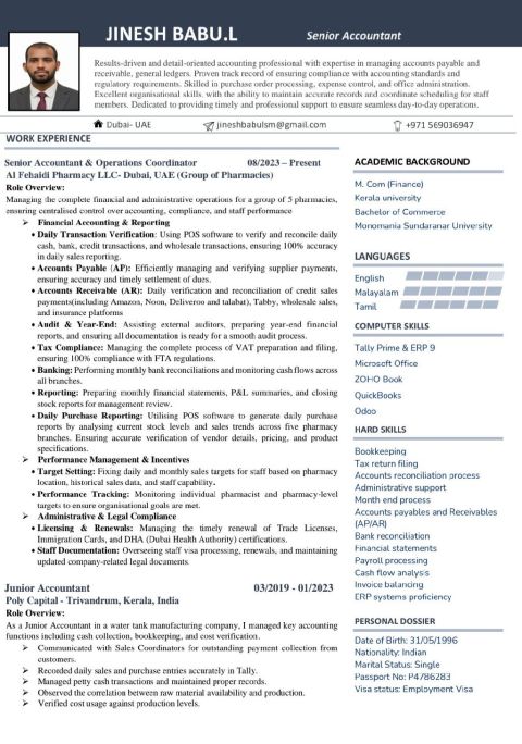 محاسب أول بخبرة تزيد عن خمس سنوات في الامارات العربية المتحدة والهند، حاصل على ماجستير في المالية. محترف ذو كفاءة عالية في تحقيق النتائج، يتمتع بخبرة واسعة في حسابات الدفع والقبض، والامتثال لضريبة القيمة المضافة، ومعالجة الرواتب، ومطابقة الحسابات البنكية. يجيد استخدام برامج Tally Prime وZoho وQuickbooks، ولديه سجل حافل في اعداد التقارير المالية الدقيقة والإدارة