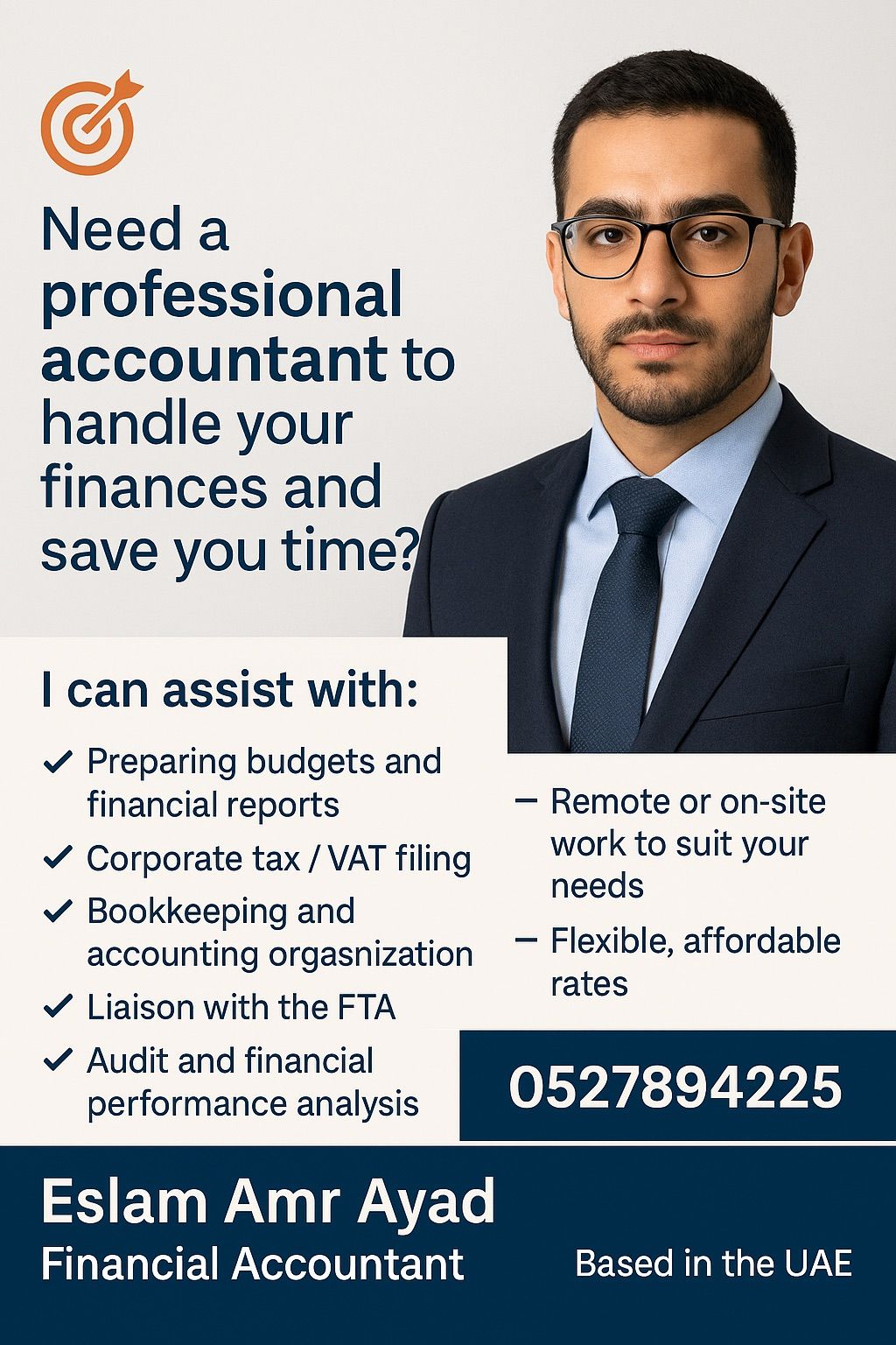 تحتاج دعم محاسبي وضريبي نوفر لك خدمات تنظيم الحسابات اقرارات ضريبة الشركات والقيمة المضافة اعداد الميزانيات والتقارير متابعة مع الهيئة الاتحادية للضرائب الامارات - حضوريا أو عن بعد خلي حساباتك علينا وركز في شغلك