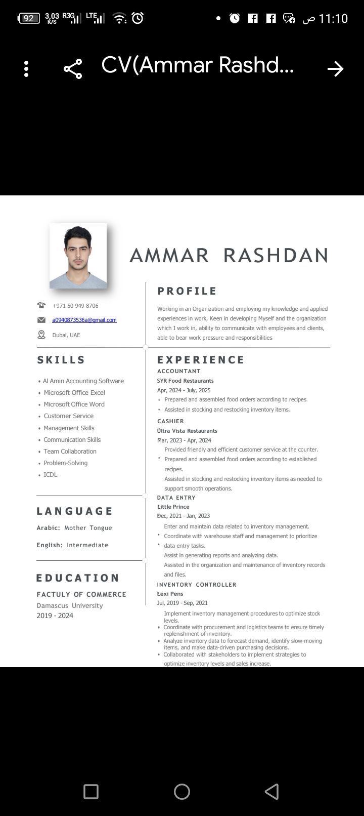 محاسب أو مساعد محاسب أو كاشير جاهز للعمل ذو خبرة جيدة في الحسابات واعداد التقارير مقيم في دبي العمر 25