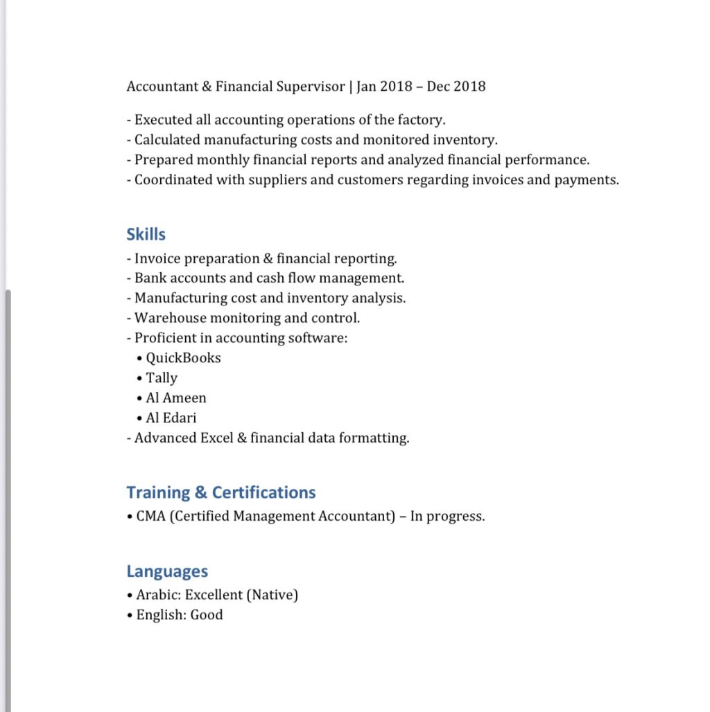محاسب عام امتلك خبرة تمتد لأكثر من 10 سنوات بمجال المحاسبة في دولة الامارات العربية واعداد الميزانيات والحسابات الضريبية والالتزام بالأنظمة المحلية المالية. حاصل على عدة دورات في المحاسبة والضرائب وأدرس الآن دورة CMA، وأتقن استخدام العديد من برامج المحاسبة الحديثة'يمكنني العمل كدوام جزئي أو كامل