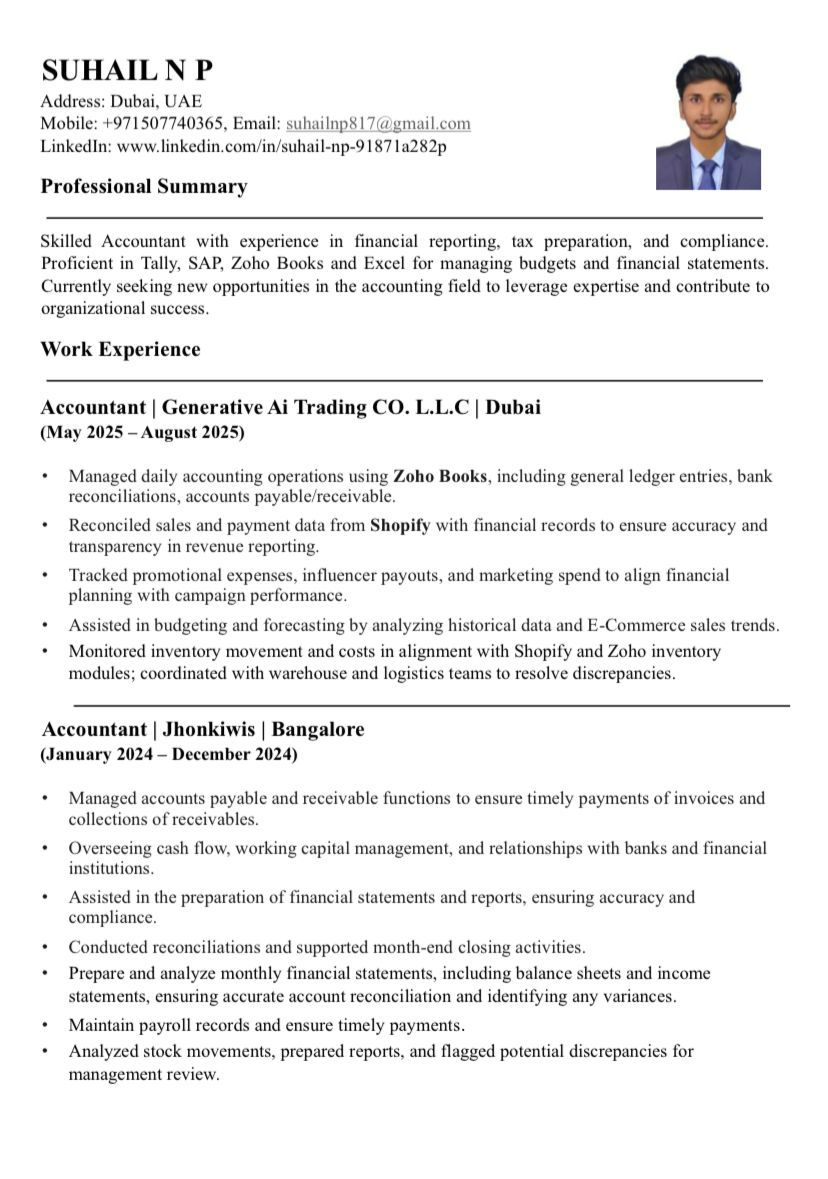 Hello, My name is Suhail N P and I am currently seeking accountant opportunities in Dubai. With over 2 years of professional accounting experience, I have a solid background in Financial reporting, tax preparation, and compliance Hands - on use of Zoho Books, Tally, SAP, and Excel E commerce finance operations including Shopify reconciliation Accounts payable/ receivable, bank reconciliations, inventory