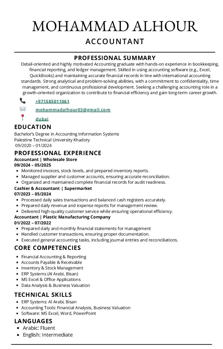 Job Search Announcement - Accountant/ Assistant Accountant My name is Mohammad Alhour, a Palestinian national, currently seeking a position as an Accountant or Assistant Accountant. I have experience in preparing journal entries, bank reconciliations, financial reporting, and account follow - ups. I am proficient in accounting software such as Excel, Quickbooks, and accounting systems like Bisan I