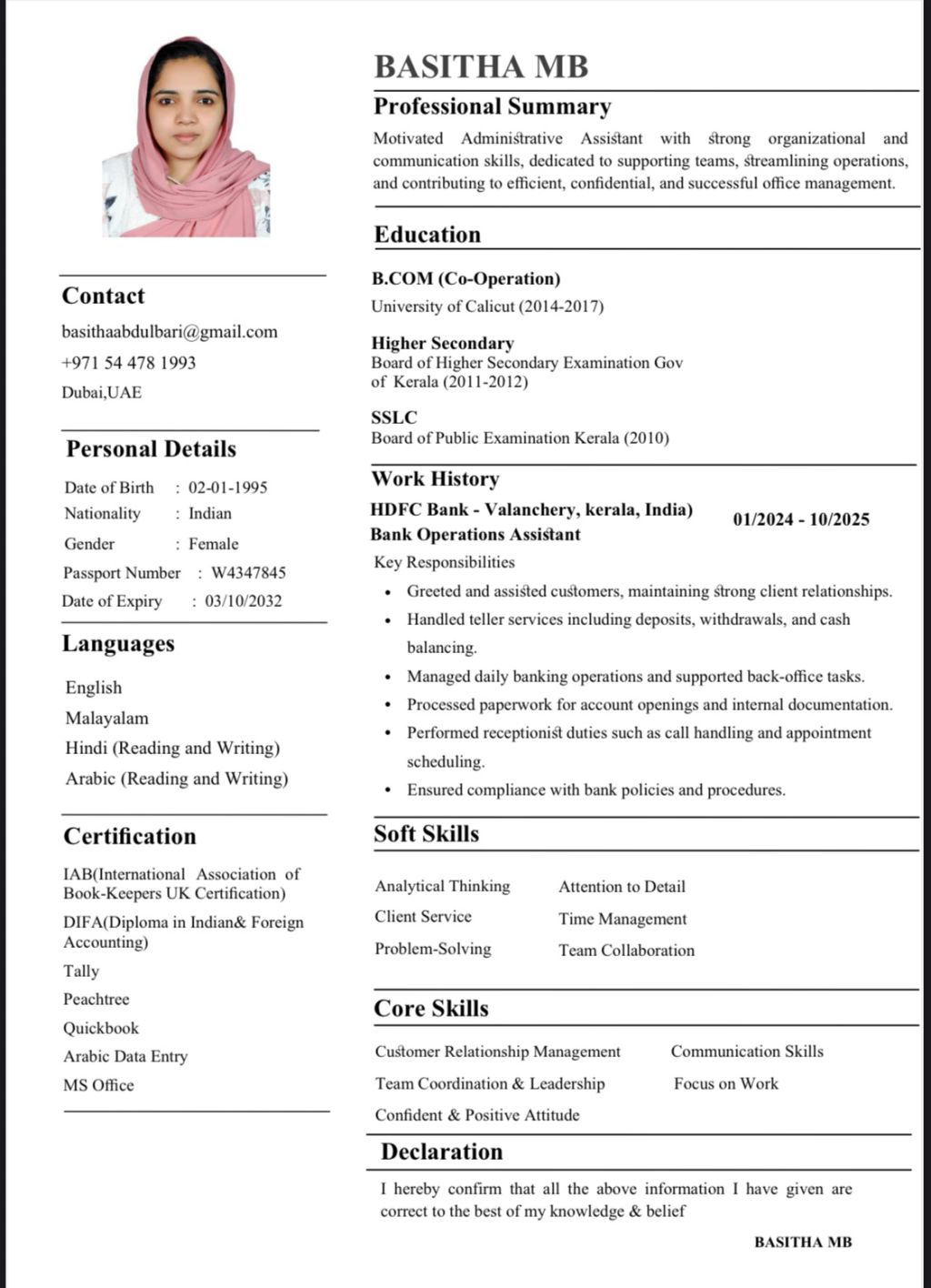 I am Basitha from India. I have 2 years of experience in admin - related jobs. Currently, I am on a tourist visa with one month remaining before expiration. I have experience in accounts and administrative work. I am looking for a job in Dubai and am available to join immediately