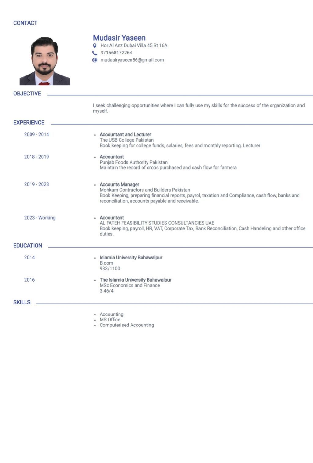 Dear Employer, I am a motivated professional accountant having a deep knowledge about accounting and finance with an experience of 9 + years, 2 + years in Dubai) I ensure my hard work with the requirements of the time and my professionalism in my feild. I am looking for a good opportunity to reward my academic and practical qualifications
