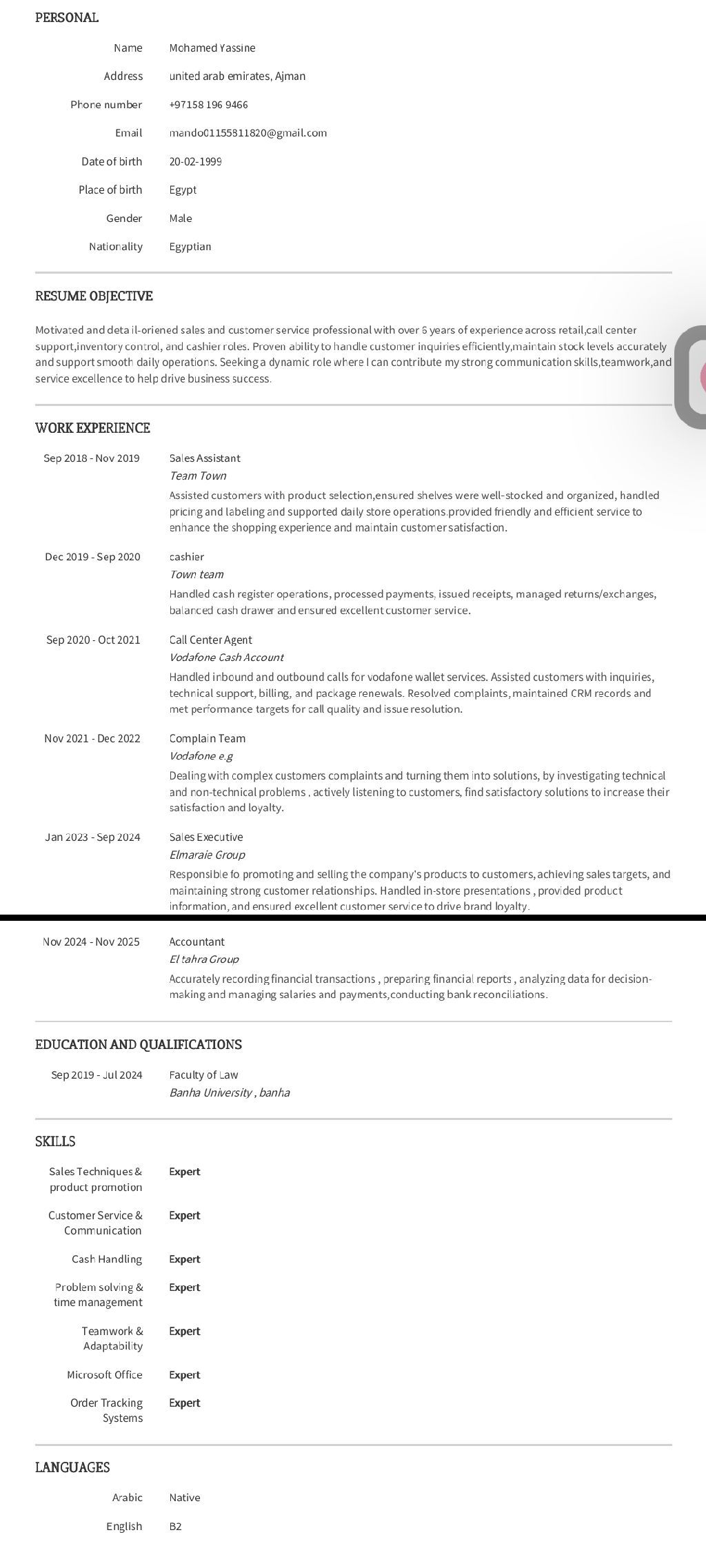 I am looking for a job as an accountant, sales specialist, customer service representative, or cashier. I have a two - year residency permit in the country