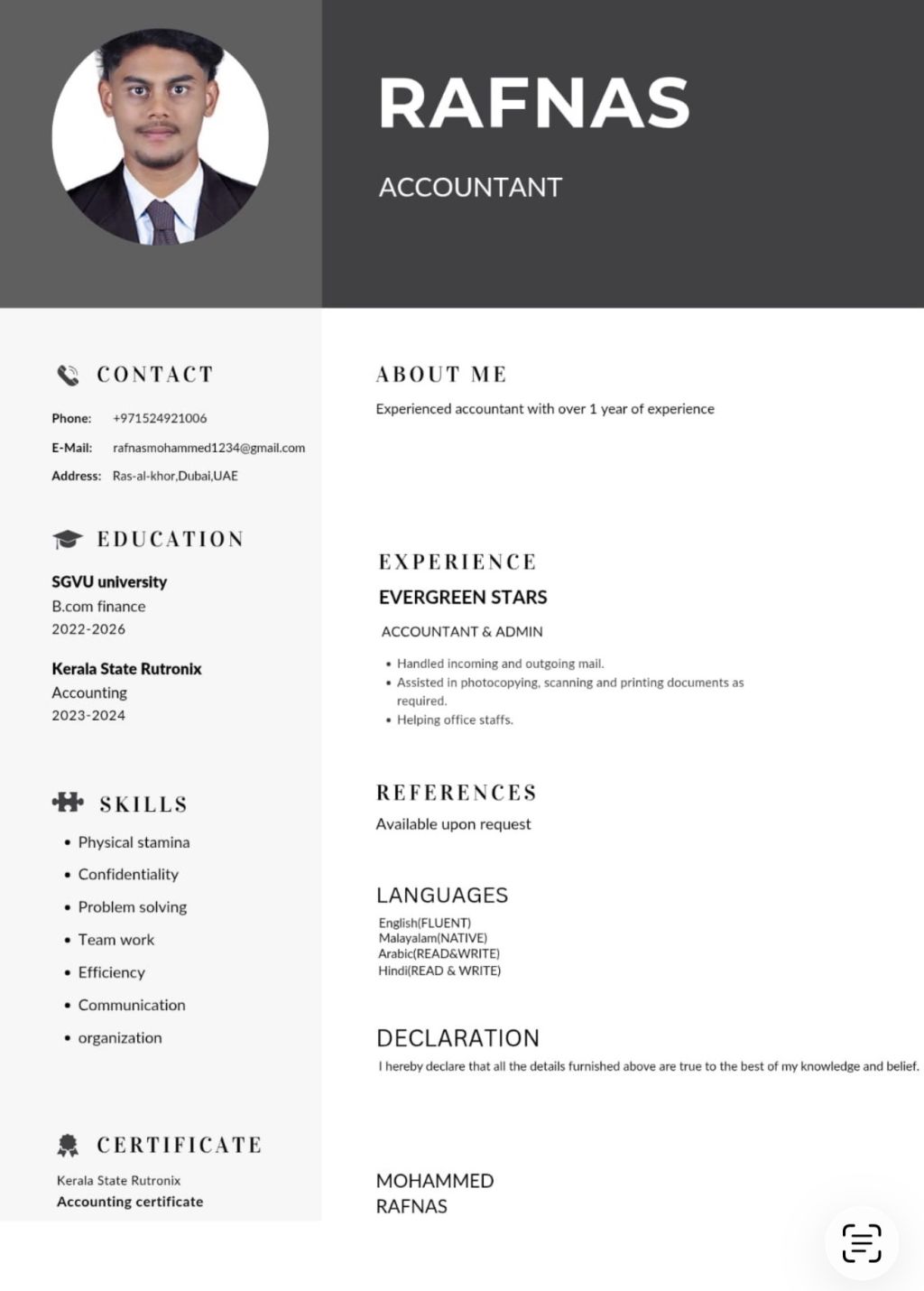 Rafnas from India. I had done B com finance and diploma in Financial Accounting. Currently working in Dubai. I am looking for a better opportunity. I am available to join immediately