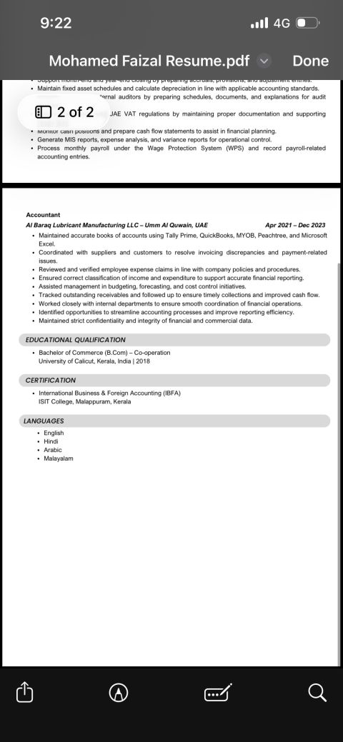 Looking for accounting vacancy. Good accounting knowledge in the area of AR, AP, Billing, Invoicing, Bank Reconciliation, Payroll processing, and supporting audit, VAT filling and also have maintain good relationship with customers and suppliers. immediately available for join