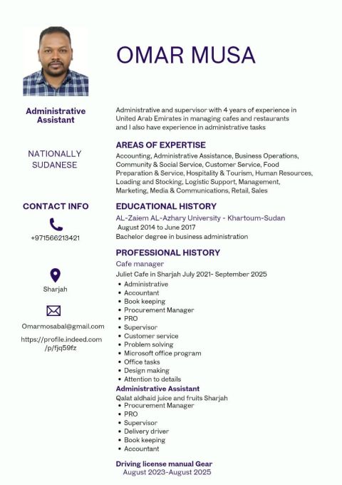 اداري مع 4 سنوات خبرة في الاشراف على الكافيهات مع متابعه المهام الاداريه من عقود وتخليص معاملات حكوميه واقامات مع رخصة قيادة مركبة خفيفه
