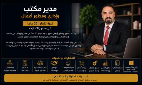 Egyptian administrative manager and business developer age 37 Holds a bachelor's of commerce and a diploma in public administration, have 14 years of experience in Qatar as administrative manager, assistant executive manager, business developer, purchasing and sales manager for some companies Able to conduct feasibility studies, restructure companies and supervise various departments etc