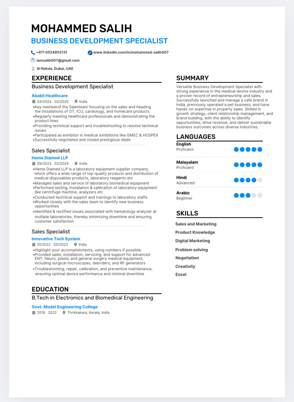 Versatile Business Development Specialist with strong experience in the medical device industry and a proven record of entrepreneurship and sales. Successfully launched and manage a cafe brand in India, previously operated a pet business, and have hands - on expertise in property sales