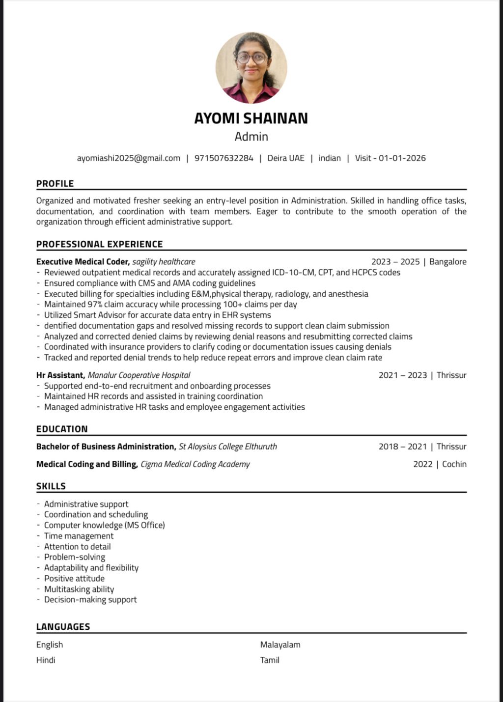 Hi I am Ayomi Shainan. I am looking for an opportunity in administration position. Motivated and detailed oriented professional with two years of experience in medical coding and HR assistant. Skilled in handle administrative tasks such as documentation, data management, employee coordination, office support, best communication skills and organisational abilities