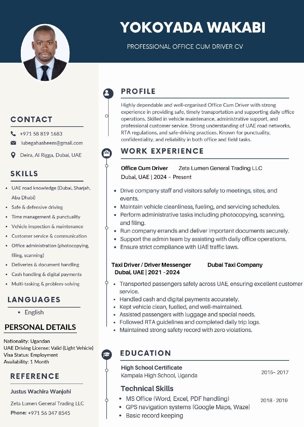 A reliable and well - organized Driver Cum Office Assistant with strong knowledge of UAE roads, excellent customer service skills, and the ability to support daily office operations. Skilled in safely transporting executives, staff, and documents while maintaining vehicles in top condition. Experienced in handling administrative tasks such as filing, deliveries, scheduling, office errands, and basic