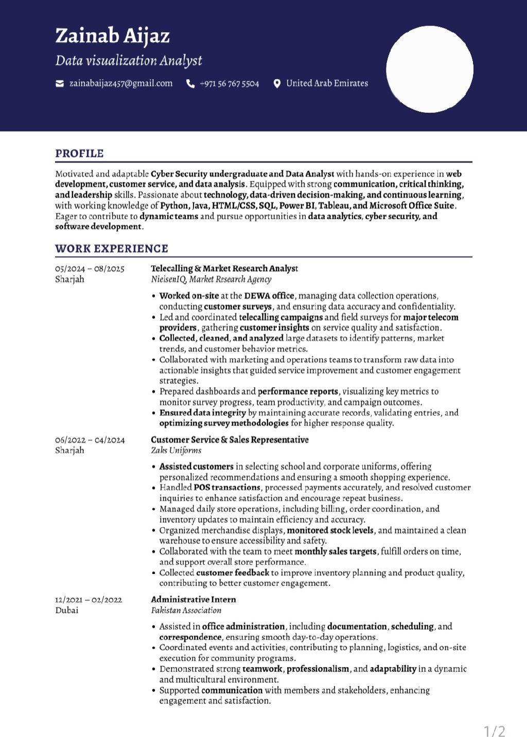 Available for immediate employment. Entry - level IT professional with background in Cyber Security and hands - on experience in data entry, reporting, system support, and client coordination. Skilled in documentation, data accuracy, Microsoft Office, and problem solving. Bachelor’ sHons) in Cyber Security. Fluent in English, Urdu, Hindi, basic Arabic. Valid UAE driving license. UAE based, shift flex