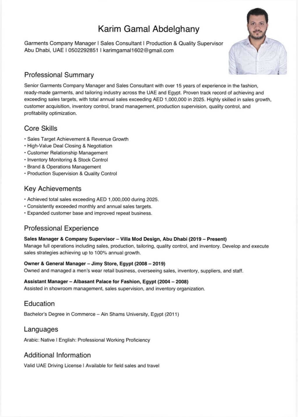 خبرة 15 عام في مجال بيع وتصنيع الملابس الجاهزه كفاءة عالية في تحقيق التارجيت المطلوب وتحقيق أعلى ربحيه. خبرة 7 سنوات داخل الامارات كمدير مشغل لتصميم وخياطة الملابس استلام وتسليم طلبات العملاء وتلبية جميع احتياجاتهم. حضور قوي للفعاليات والمعارض. تشغيل العمال بشكل مستمر وفقا لمتطلبات العمل