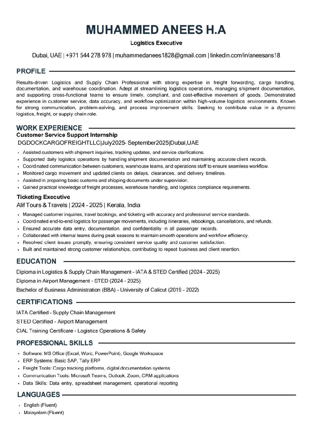 Logistics Professional Seeking Opportunity I am actively looking for an opportunity in the logistics field where I can learn, grow, and contribute to daily operations. I have a strong interest in logistics and supply chain activities, including coordination, documentation, shipment tracking, and customer support