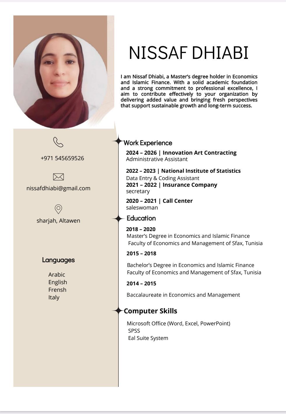 I am Nissaf Dhiabi from Tunisia. I have practical experience in the UAE within work environments that require accuracy and continuous follow - up. I possess strong organizational and communication skills, and I am seeking a job opportunity where I can contribute to achieving tangible results while continuing to develop my professional experience